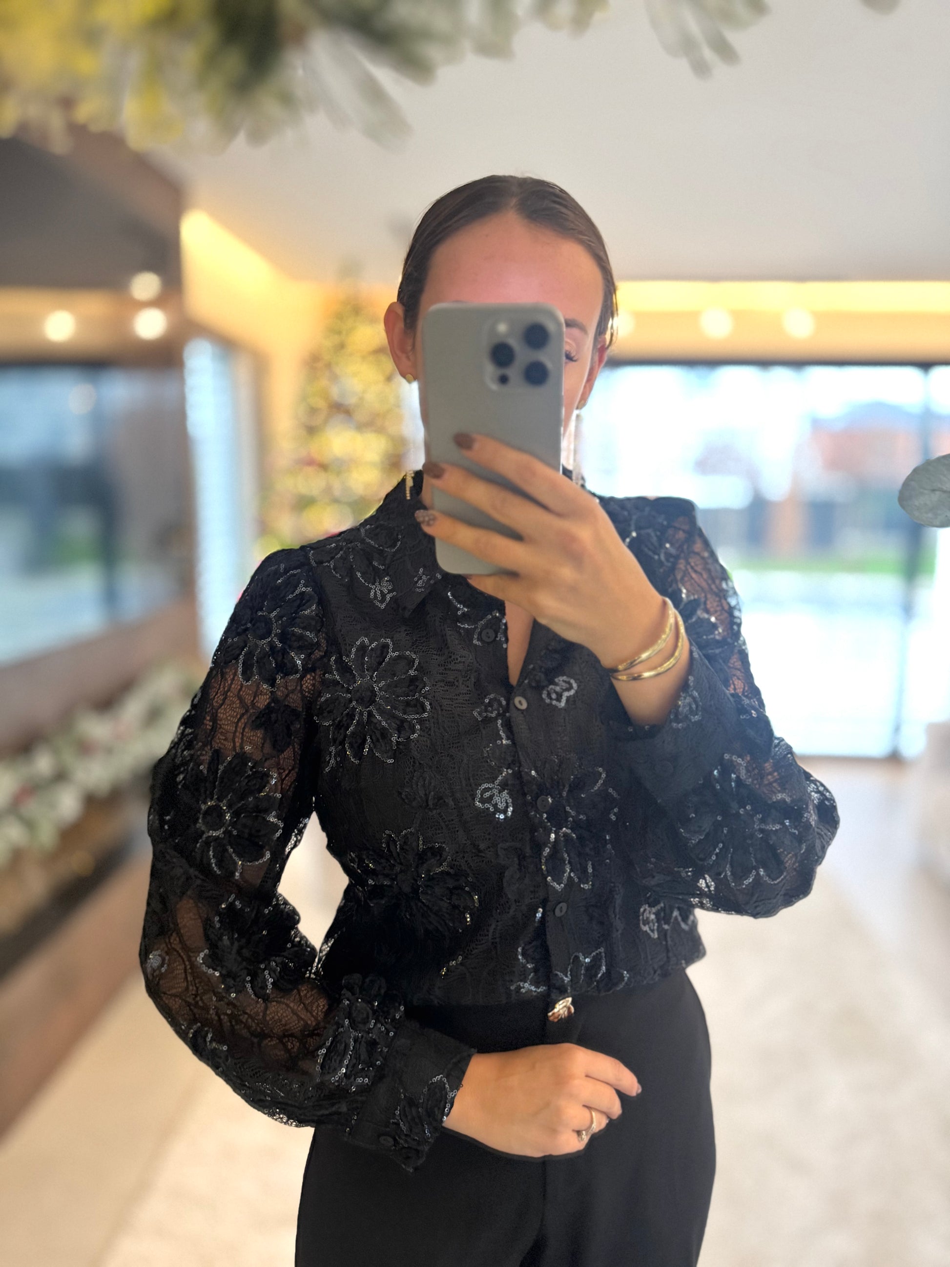 - Chemise courte noire à dentelle et sequins