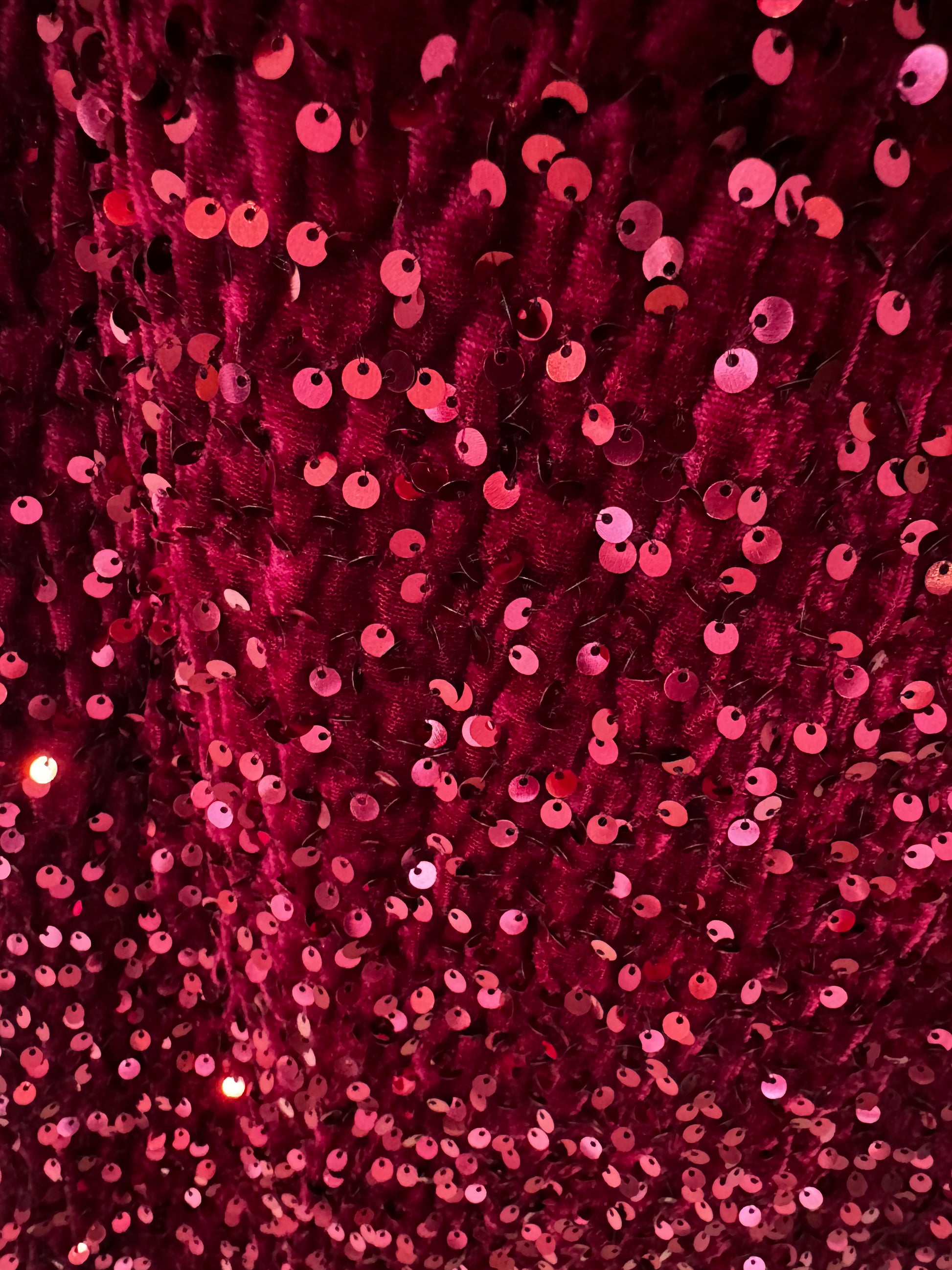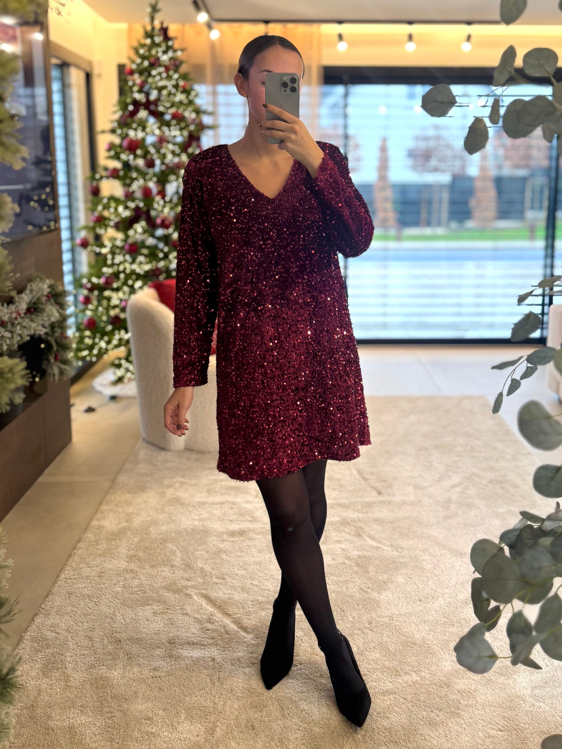 - Robe courte à sequins bordeaux sur l’ensemble de la robe