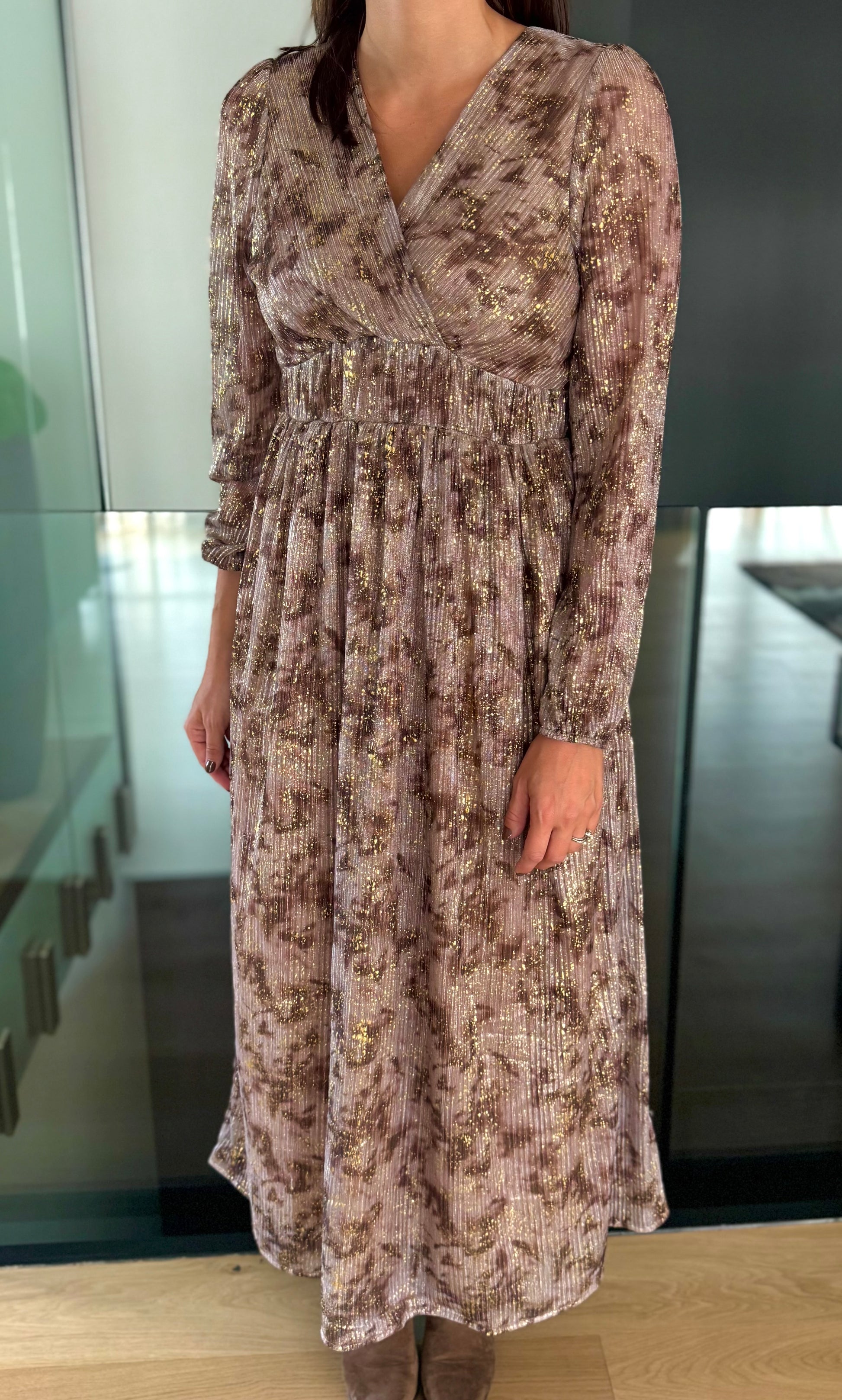 - Robe longue à motifs beiges et dorée